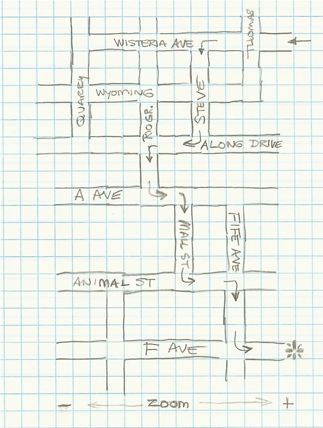 The puzzle will consist of a single image done in the style of the suburbia map shown by RJ during the trailer videos [see sample image below]. For this puzzle, we just need a smaller section done in that style, but with some of the streets labeled and some directional arrows added as shown: