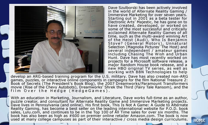 BIO | CLIENTS | ARGs | non-ARGs | PUZZLES | BOOKS | TIMELINE | PRESS | MUSIC | CONTACT