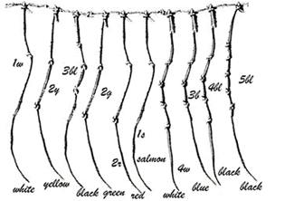 The number / letter pairs in the drawing represent the number of knots on each pendant string and the color of the string itself. So 1w = 1 knot on a white string, which should match the string color shown at bottom. In some cases two letters are used (bl = black) because another color is already using just the single initial. For reference sake, the number / letter pairs shown above are: 1w, 2y, 3bl, 2g, 2r, 1s, 4w, 3b, 4bl, 5bl. It’s important that the full color names be written out as shown at the bottom.